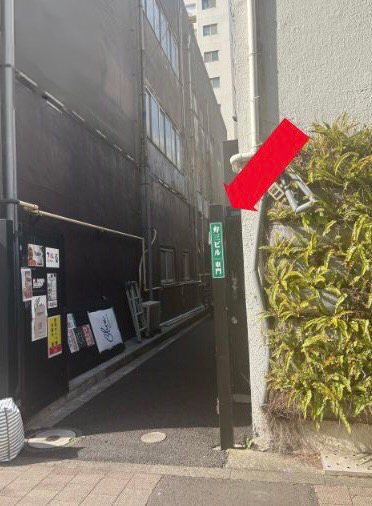 ⑤平和交通の裏手門に、緑色のプレート(弁天ビル 東門)があります。(道路を挟んだ向かい側はファミリーマートです)