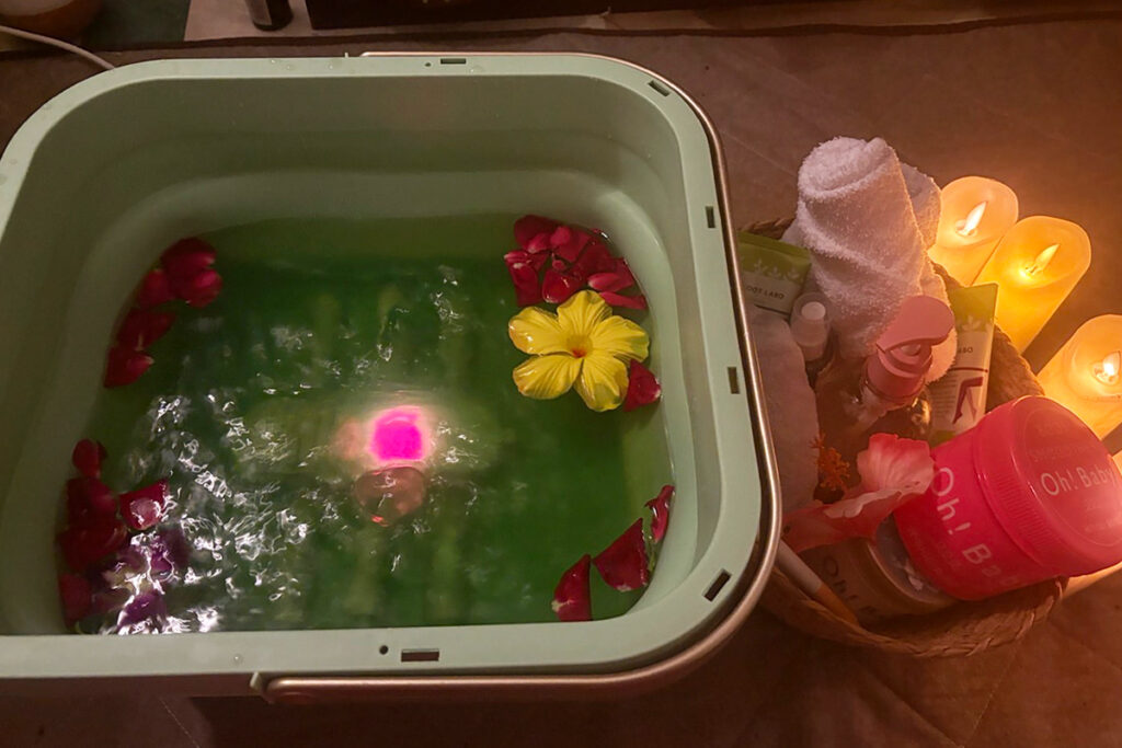 Includes stretching, head massage, and 10 minutes of oil massage on the calves or back, plus an aromatic foot spa (warm foot bath) or shower.