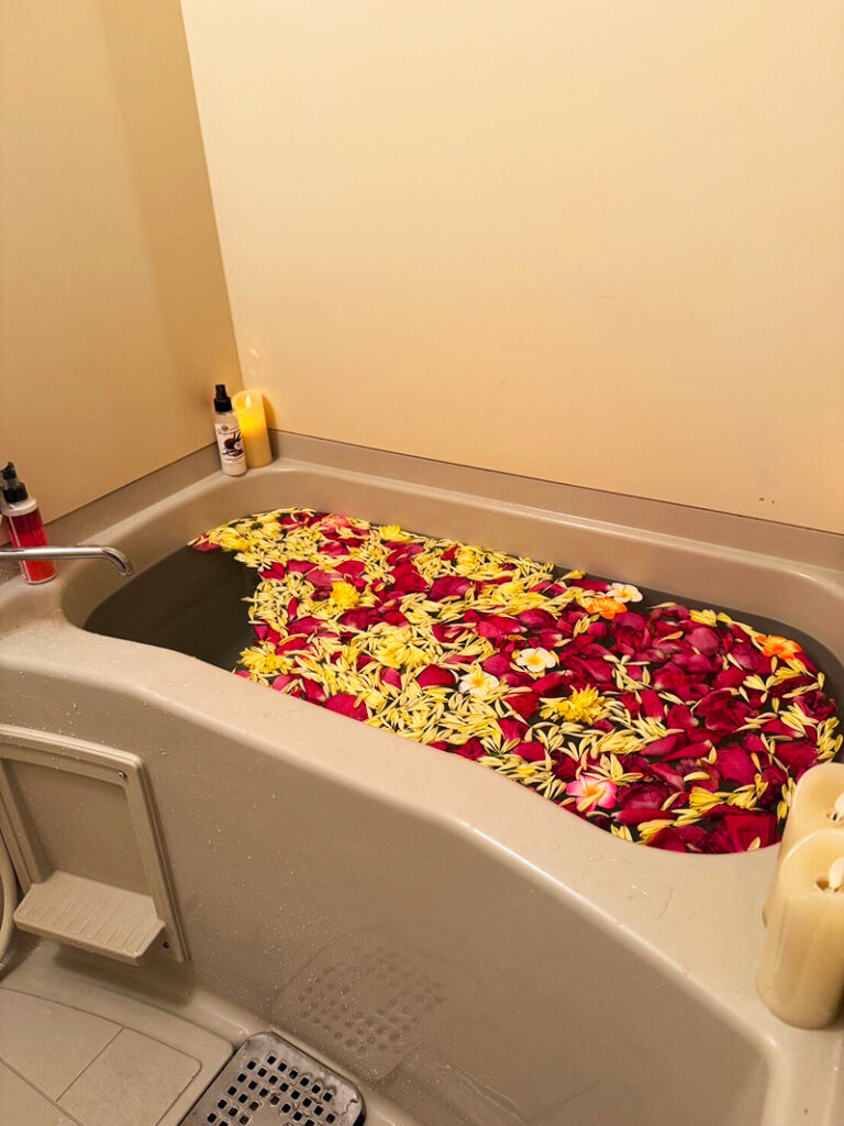 100分以上のコースはフラワーバスが利用出来ます。フラワーバスの入浴剤はお好みの香りを選べます。